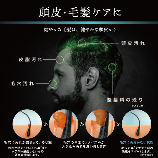落としきれないメイク残りや頭皮に詰まった皮脂落としに、ナノレベルのケアが可能です。