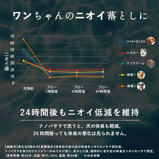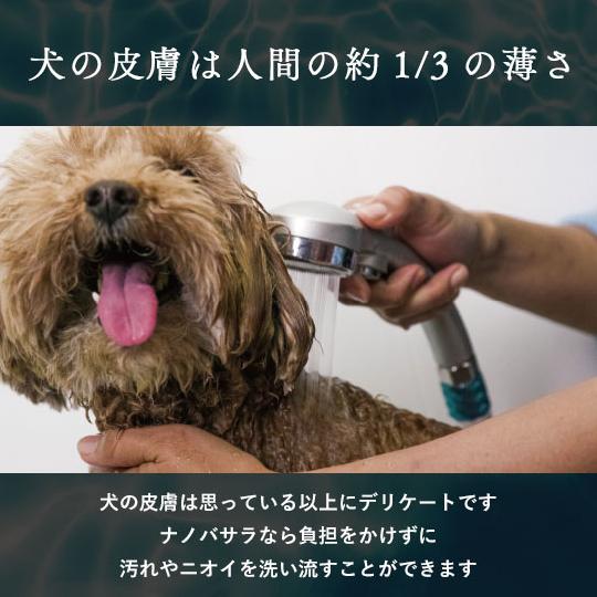 犬など毛が多く洗いにくい場合でも、ナノバサラなら手の届かない毛穴の奥まで入り込むため、いつもより少ないシャンプー剤、もしくは水だけでも汚れやニオイは落ち、毛並みもフワフワになります。※犬種や猫種、シャンプー習慣、汚れの度合いによって、感じ方には差があります