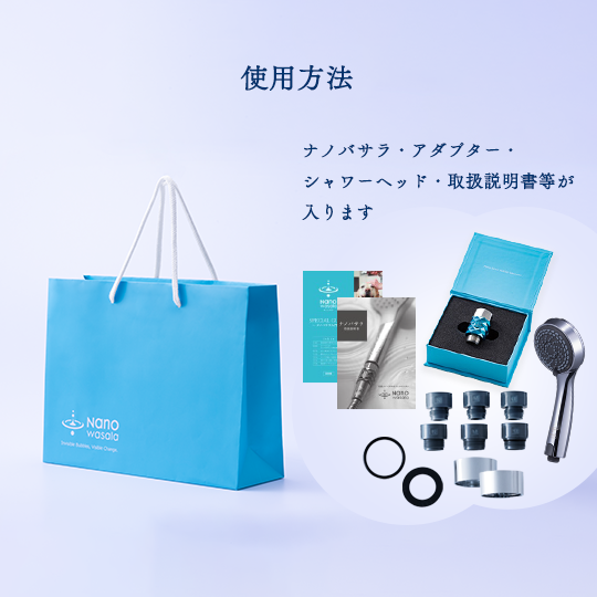 ・シャワー用ナノバサラ(ノズル)、専用シャワーヘッド、取扱説明書、付属品(アダプター)、カタログが入るサイズです。 ・プレゼントなどにご利用いただけます。