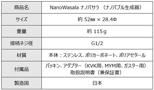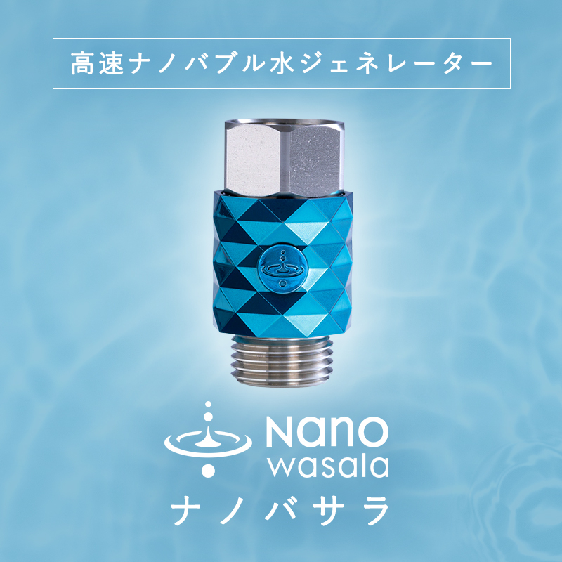 「NanoWasala(ナノバサラ)」は業務用に開発された優れた技術を担保しながら、シャワー用として洗練されたデザインにアレンジしたナノバブル生成器で、生成するバブルは0.001㎜未満※1の「ナノバブル」のみです。※2マイクロバブルより小さいナノバブルを高速で作り出し、高効率洗浄・浸透・植物の成長促進など、日々の生活に様々な効果をもたらします。一般家庭だけでなく、ヘアサロン、ペットサロン、宿泊施設などプロの現場でも導入されています。